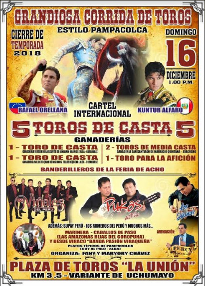 No obstante el diestro venezolano regresa a Venezuela tan pronto cumpla con la noble afición de Pampacolca en el Departamento de Arequipa, donde da por cerrada su gran campaña incaica el próximo 16 en regio mano a mano con el torero local Kuntur Alfaro y toros de las prestigiosas ganaderías de la Virgen de la Ajusta de Benjamín Barrios y Hnos. Téllez Requena en la plaza de toros La Unión, vía de Uchumayo.